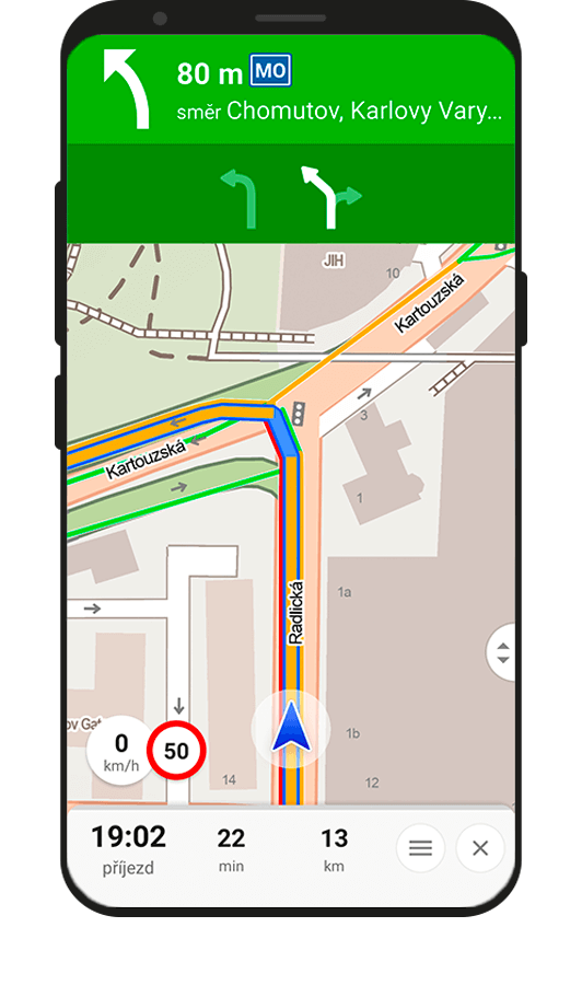 Povolenou rychlost máte neustále na očích a když ji překročíte, aplikace vás na to hned upozorní. A navíc pozná, kde se měří.