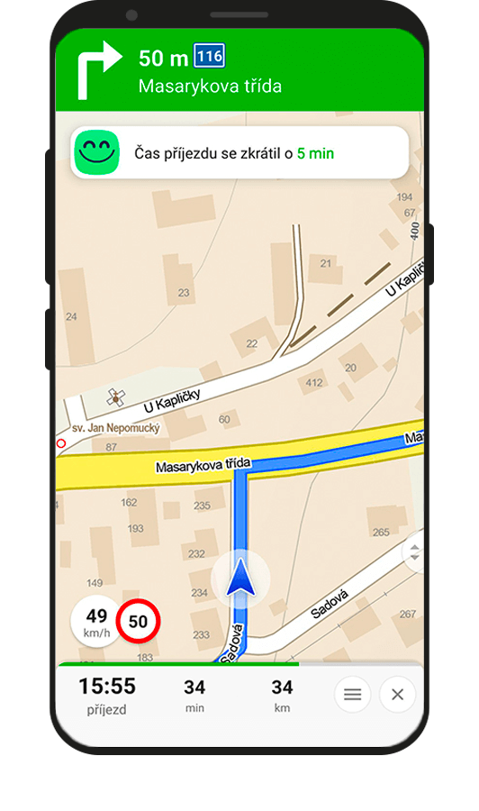 Aplikace sleduje plynulost dopravy i během vaší jízdy a trasu neustále upravuje tak, abyste byli co nejdříve v cíli.