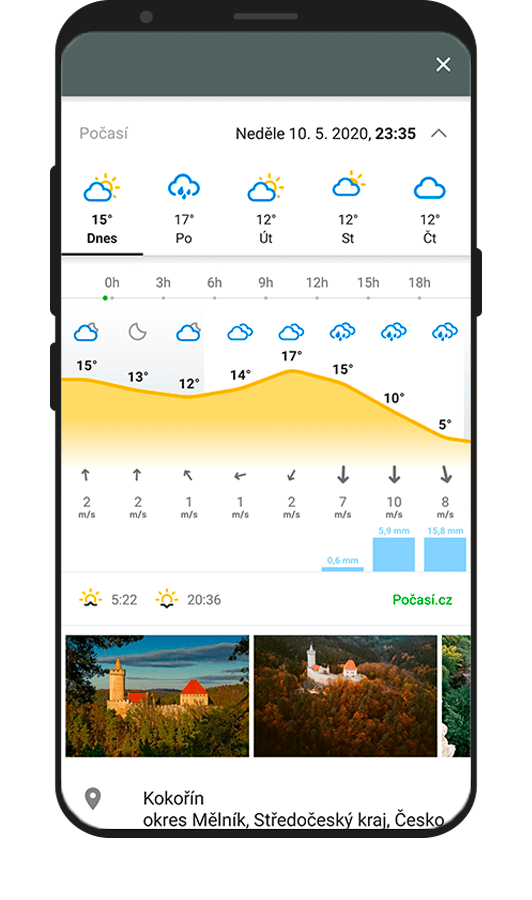Nenechte se zaskočit počasím. Při každém plánování trasy zjistíte, jak bude v cílové destinaci. A to až na 5 dní dopředu. Aktuální informace o teplotách, srážkách či východu slunce