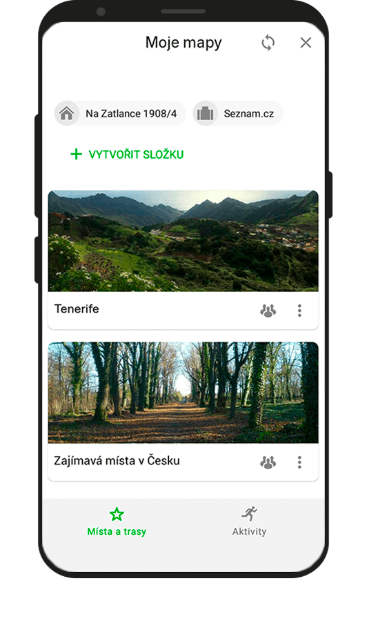 Své výlety si přehledně zorganizujete do složek. Včetně tras, zajímavých míst po cestě nebo vlastních fotek. Celé složky snadno nasdílíte ostatním.