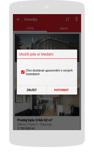 Své hledání si můžete uložit a dostat se k němu jedním kliknutím z hlavní stránky. Zároveň si můžete nechat posílat upozornění, kdykoli přibude inzerát, který splňuje vaše požadavky.